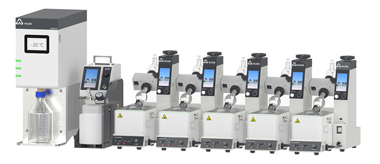 高效冷凝、減少污染 陣列旋轉蒸發(fā)儀可以選擇 eSR 系列溶媒回收儀用于溶劑蒸汽冷凝回收,溶媒回收儀的多級直接冷凝技術可以將溶劑蒸汽高效的液化收集,減少溶劑蒸汽排放。eSR 系列溶媒回收不需要添加冷卻循環(huán)液,也不需要連接玻璃冷凝器,開機即用,操作維護更簡單。